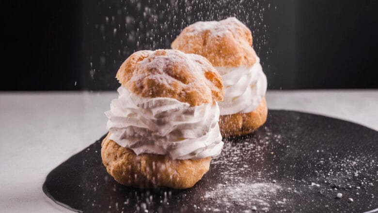 5. Skär av locket, fyll med mandelmassa och grädde, och pudra över florsocker.