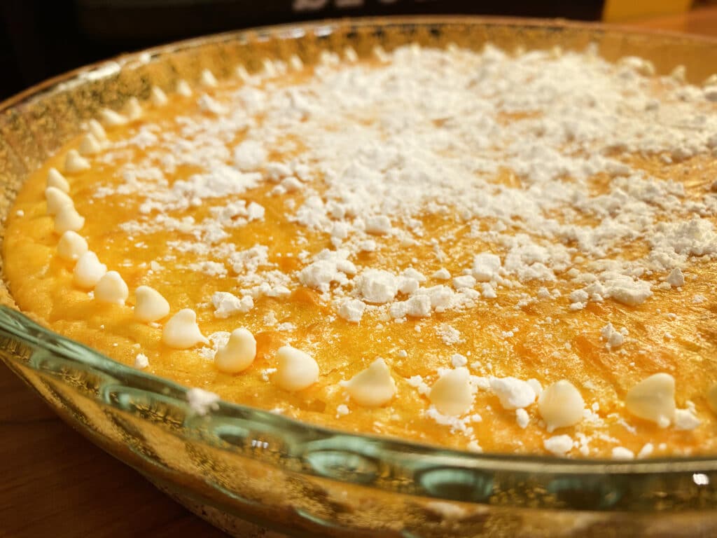 Toppa kakan med florsocker och riven vit choklad. Servera med löst vispad grädde.