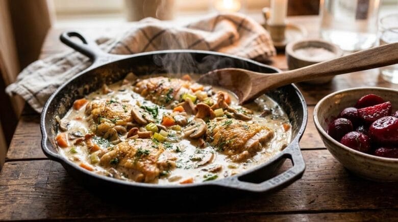 Tänk dig en mustig och gräddig kycklinggryta där smakerna av dragon, timjan och cognac gifter sig perfekt med varandra. Det är precis vad den här krögarpannan bjuder på. Till detta serveras ljuvliga rödbetor som fått bada i smör och honung tills de blivit alldeles glansiga och oemotståndliga. Det är en rätt som känns sådär härligt lyxig och arbetad, men som faktiskt är förvånansvärt enkel att svänga ihop.