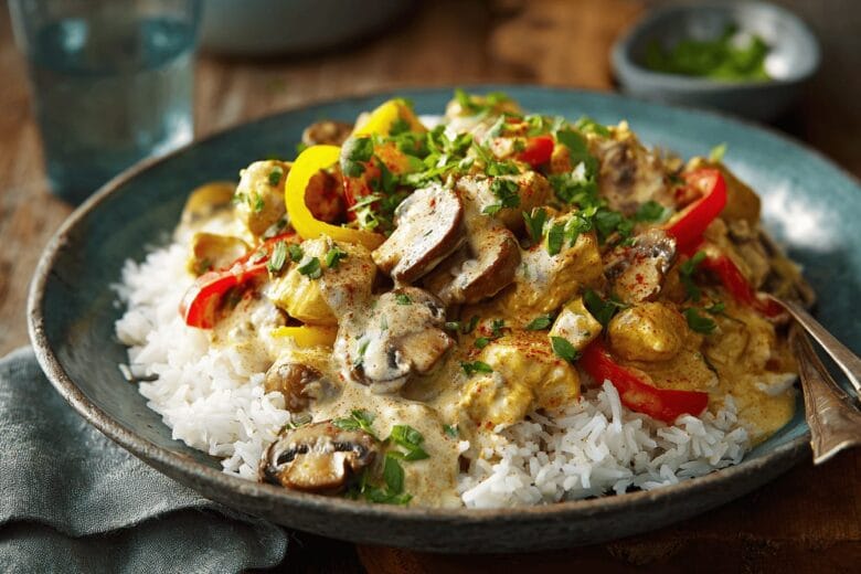 Den här rätten är både smakrik och enkel att variera – välj kycklingfilé eller vegetariskt alternativ som Quorn. Kantareller ger extra höstkänsla, men det går lika bra med annan svamp. Kombinationen av curry, vitlök, ingefära och krämig gräddsås gör grytan till en fullträff.